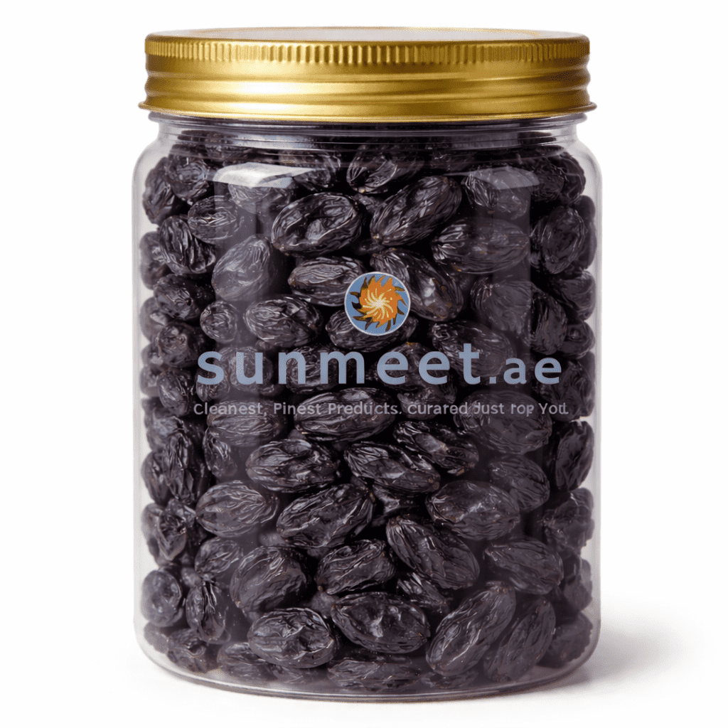 Naturally plump, deep in colour, and richly sweet, our jumbo black raisins are carefully hand-selected for their superior size, softness, and flavour. Hygienically packed in a sturdy plastic jar with a golden lid, they stay fresh, juicy, and ready to enjoy every day.